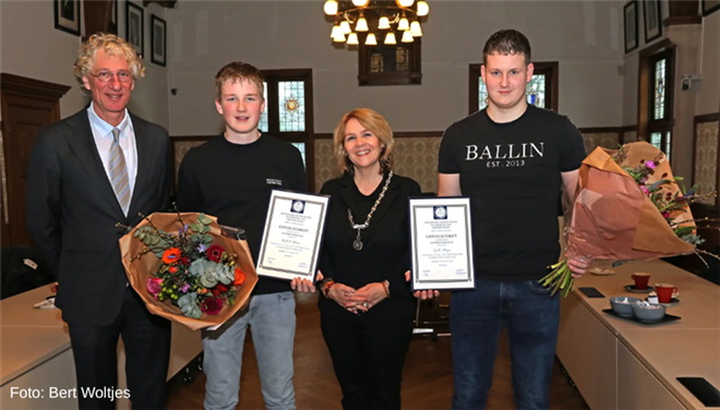 Gerben springt zonder aarzeling in het water. Hij vindt de man op de bodem en komt weer boven. Met moeite weet hij een steiger te bereiken, waar Ruben hem helpt aan de kant. Wanneer de man op zijn zij ligt, komt er veel water uit zijn mond. Aangezien de ambulance nog niet was ingeschakeld, heeft Ruben dat vervolgens gedaan. De redders kregen warme dekens in een politieauto. Het slachtoffer werd naar het ziekenhuis vervoerd, waar zijn toestand al snel verbeterde. De Maatschappij bekroont de beide neven met een zilveren medaille. |