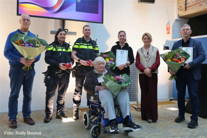 Twee medewerkers van jachthaven De Domp, in eerste instantie de 36-jarige havenmeester Petra van Zuiden, en toen het te zwaar voor haar werd, ook de 54-jarige Werner Wieringa, sprongen te water. Zij hielpen het hoofd van de drenkeling boven water totdat de hulpdiensten arriveerden en de brandweer de oude vrouw uit het water kon halen. Dit proces duurt ongeveer 20 minuten, waarin de redders zich met grote zorg om de vrouw bekommeren. Het viel op dat ze huidwonden aan haar armen had en een rocheltje vertoonde. Petra van Zuiden en de hulpdiensten werden ingeschakeld door Jeroen Smaal, 65 jaar uit Enschede, die met zijn honden aan het wandelen was. Hij zag eerst de scootmobiel liggen en daarna de oude vrouw te water. De Maatschappij bekroont de twee redders met een bronzen medaille en een waarderend schrijver voor de melder. |
